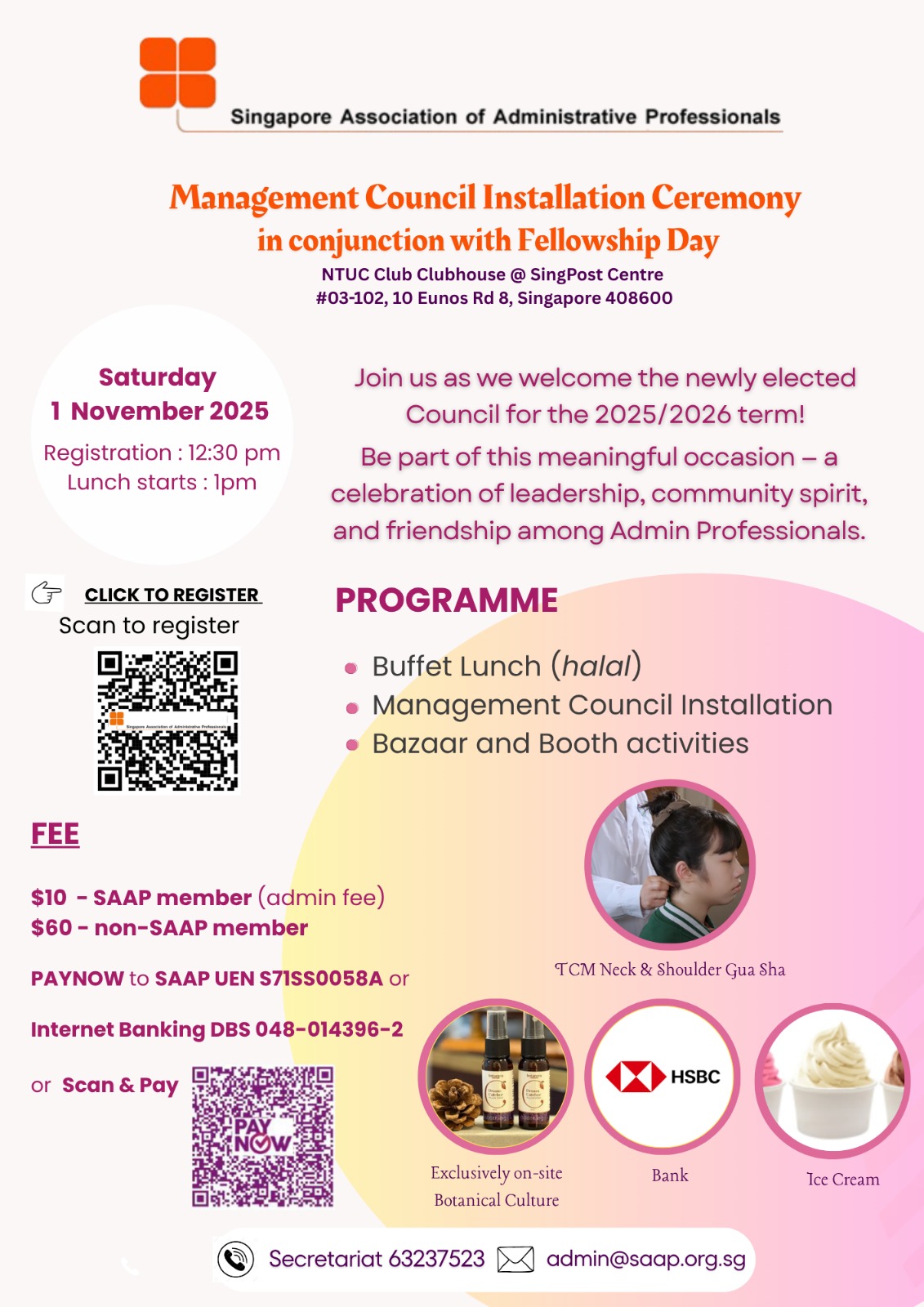 SAAP also serves as a platform for administrative professionals and secretaries to participate, contribute and learn from the various talks and activities organised. It is also an avenue for administrative professionals and secretaries to network, interact and relate their work experience with the peers.